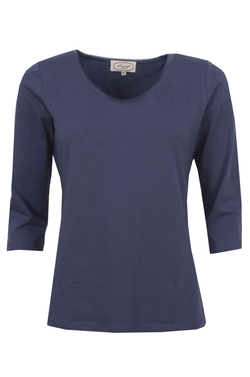 Klassisches Langarmshirt aus weicher Baumwoll-Jersey-Qualität. Dieses Basic Shirt mit einem 3/4 Arm und einen etwas tieferem Rundhals rundet eine hübsche Spitzenkante ab.