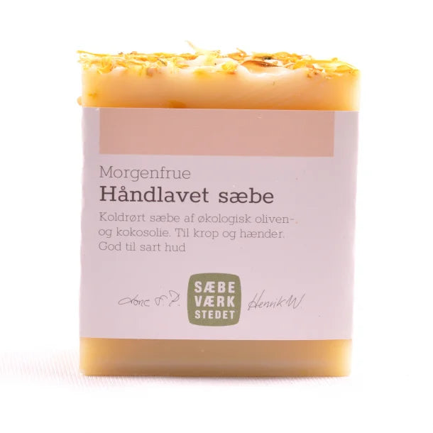 Eine sehr milde und sanfte Seife, die für Kinder und schwache Nerven zu empfehlen ist. Die Seife hat keinen anderen Duft als den Duft milder Seife. Wir haben reines Ringelblumenöl hinzugefügt, das heilend und weichmachend wirkt, und zusätzlich haben wir der Seife etwas getrocknete Ringelblumenblätter beigemischt, um ihr Charakter zu verleihen.