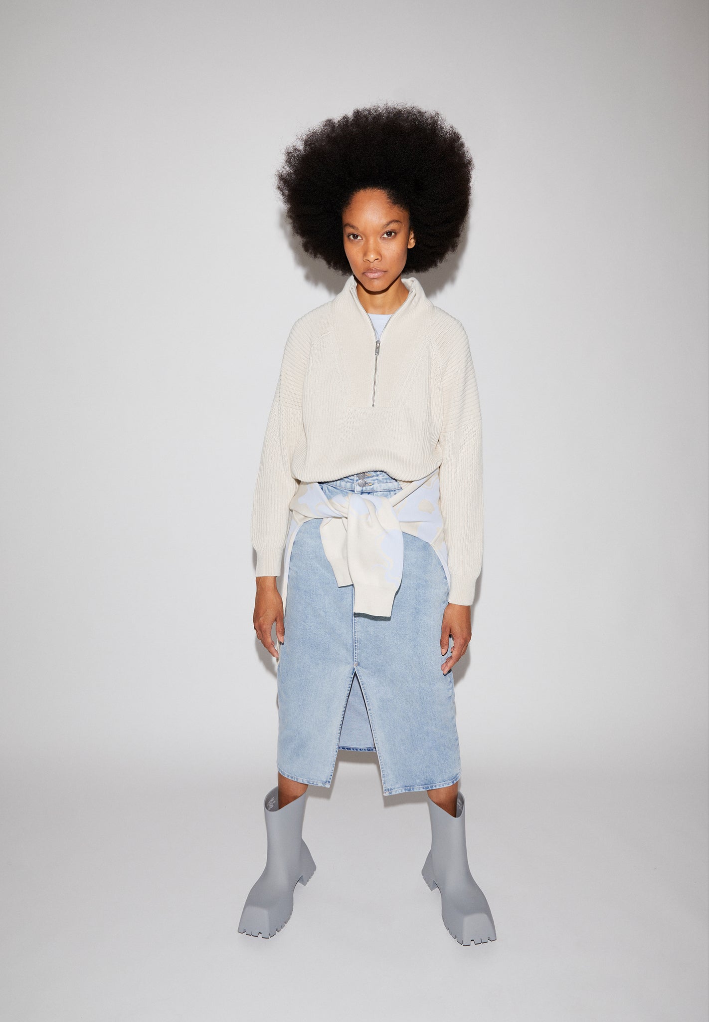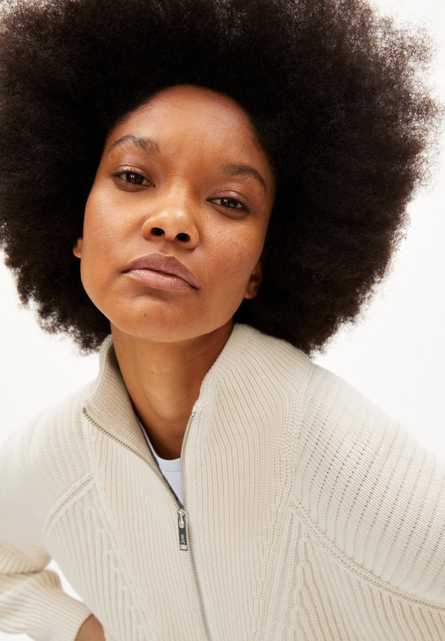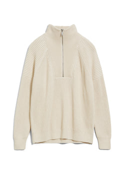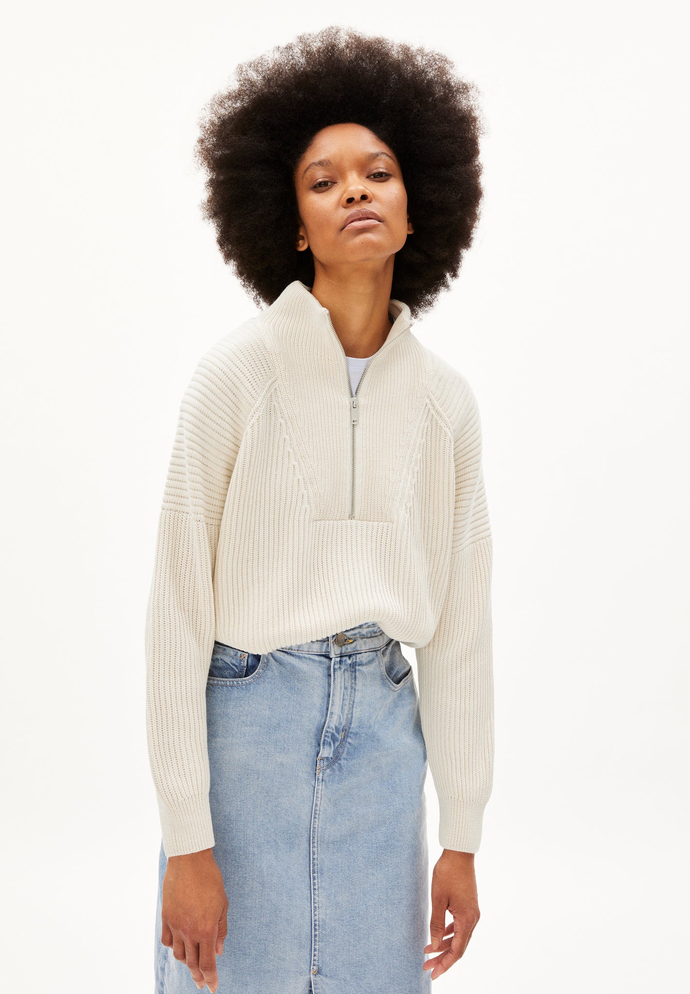 Schöner Strickpullover aus reiner Biobaumwolle. Der Troyer hat einen Kragen mit Zipper. Durch seine Loose Fit form fühlt man sich rundum wohl. Idealer Kombipartner sowohl zur Hose, als auch zum Rock.