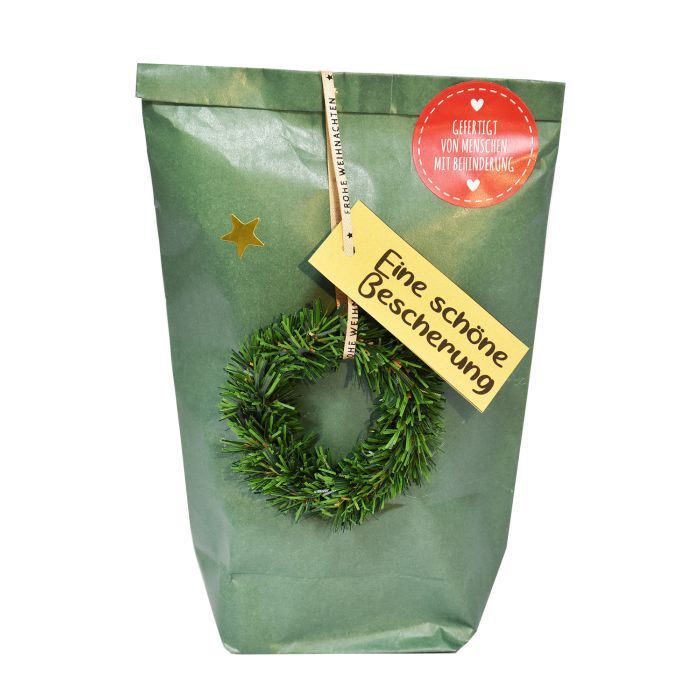 Are you looking for a special Christmas present? Our 'Schöne Bescherung' surprise bag is just the thing! It conjures up a Christmas atmosphere in no time and is filled with decorative little things like a green fir wreath, a Christmas candle and a Christmas card with a saying. And the best part? It is lovingly hand-made by people with disabilities. With this bag you are giving a small and special Christmas decoration to make the Christmas season even more beautiful.